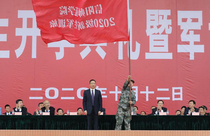 在热烈的掌声中,郜火星为新生军训旅授旗。