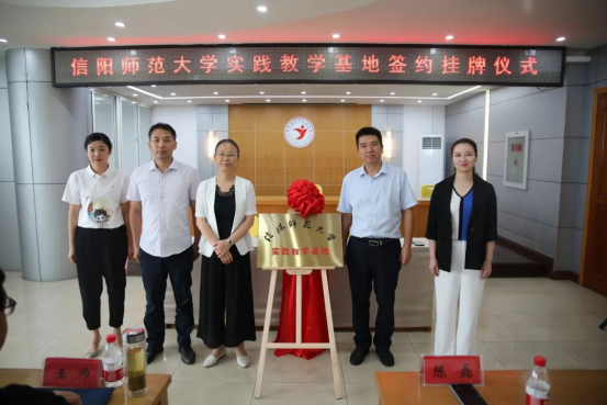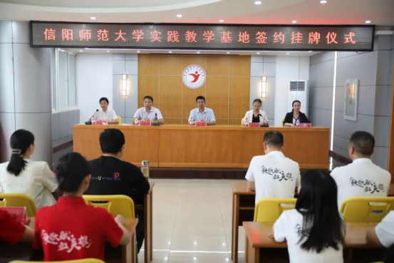 朱伟、孙文艳分别代表350vip8888新葡的京集团、信阳市中心血站签署校地合作协议,朱伟、宋建荣共同为"实践教学基地"揭牌。揭牌仪式结束后,一行人实地参观了信阳市中心血站。