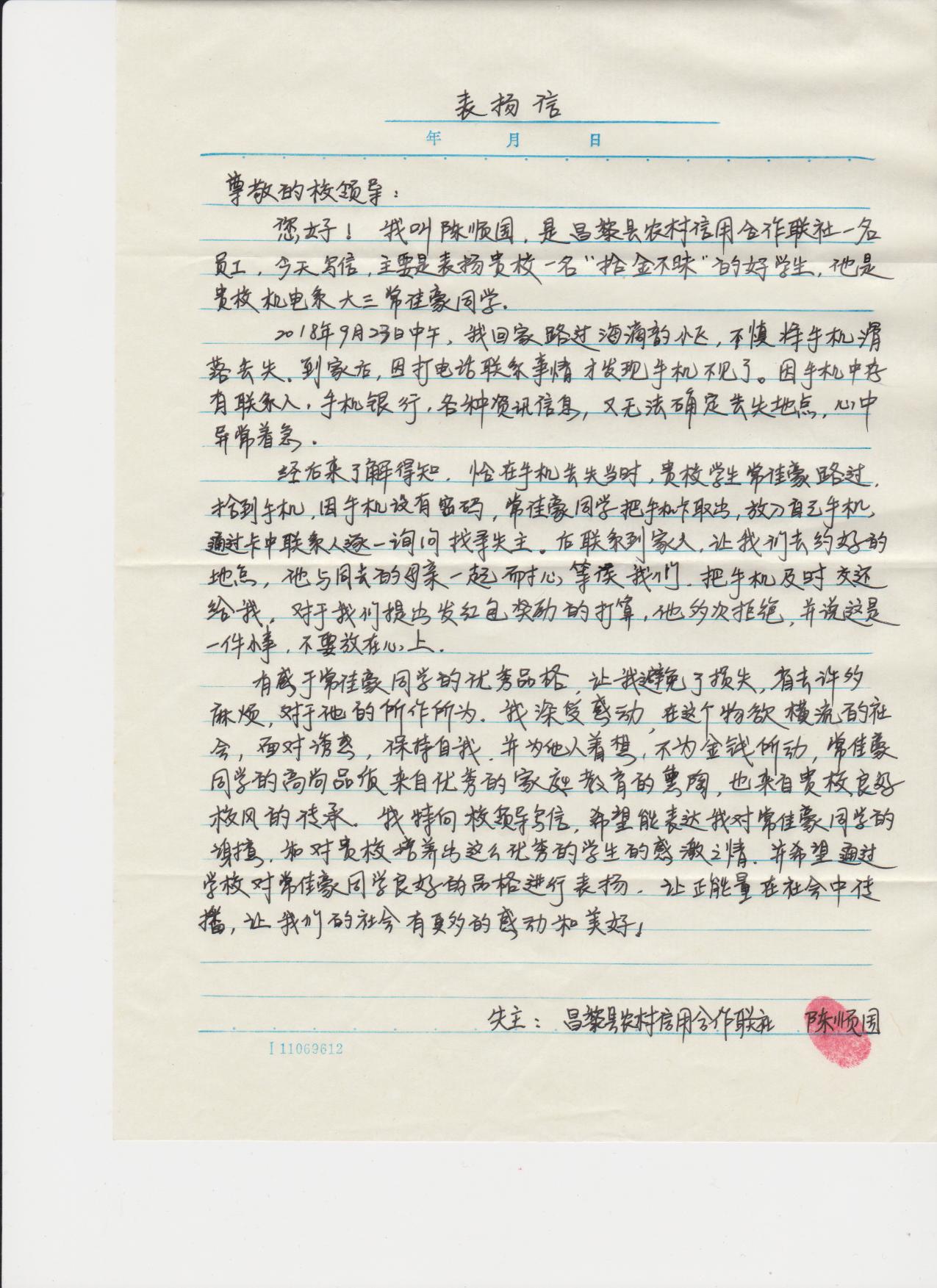 2018年9月26日,MG冰球突破官网收到昌黎县农村信用合作联社员工送来的表扬信,对MG冰球突破官网16级机制专业常佳豪同学帮助找寻手机,坚决不收红包的行为表示感谢,对MG冰球官网良好校风表示赞扬。昌黎县农村信用合作联社员工因丢失手机异常着急,常佳豪同学路过并拾到手机,与失主家人取得联系,第一时间将手机归还,并多次拒绝失主的红包奖励,最后在失主的一再追问下才告知了学校名字和自己的姓名。失主随即来到MG冰球突破官网,将感谢信送到该院领导手中,这时大家才知道该院学生拾金不昧暖人心的感人事迹。