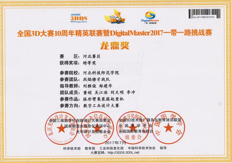 为参加全国3D大赛,MG冰球突破官网组建了由机制专业和农机专业的同学4支团队,在邓春岩、刘雅俊、张小芹等老师的精心指导下,综合运用所学的机械制图和三维建模技术,精心设计,积极创新。近日,经全国相关领域专家和教授评审,荣获大赛(河北赛区)特等奖1项、二等奖3项。