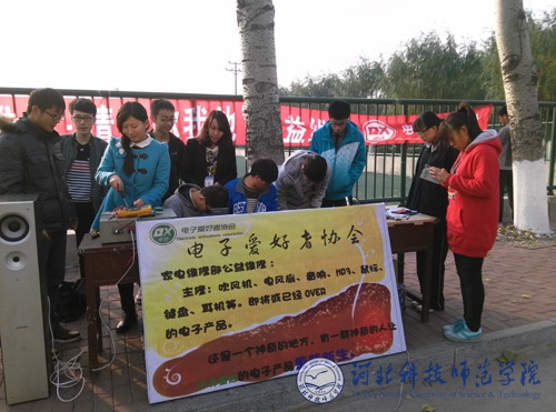 2014年11月8日上午,MG冰球突破官网举办“爱心维修•情系你我他”公益维修活动。面对损坏的电子物品,电子爱好者协会会员们耐心的进行维修,并向现场同学们进行讲解。当天,电子爱好者协会还在昌黎校区招聘会现场举办了作品展示活动,并与招聘单位,学校领导、老师进行现场交流。