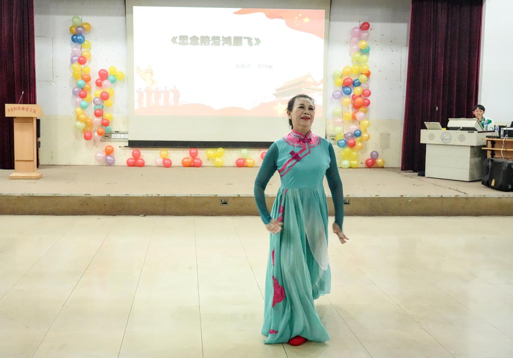 随后,春晖艺术团的赫连艳以一曲《请喝一杯下马酒》展现了蒙古族的热情好客,赢得了观众的阵阵掌声。离退休办的李国丽老师则带领大家走进了舞蹈《思念陪着鸿雁飞》的世界,用舞姿诉说着对远方亲人的思念之情。
