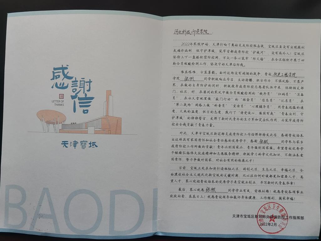 近日,MG冰球突破官网19机制张帆同学因在属地积极投身疫情防控志愿者队伍,天津市宝坻区疫情防控指挥部特发来感谢信。